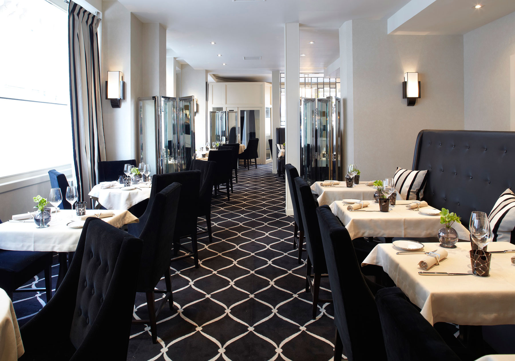 Most of all, this chic restaurant with an updated Art Deco-inspired décor marks a new chapter for renowned chef Frederic Simonin. Hence, it seems a safe bet that his immense talent will draw in the Parisian clientele to his eponymous establishment in the 17th arrondissement. Moreover, Frederic Simonin prepares traditional and modern cuisine in high fashion. For example ecrevisses (crayfish) façon marinière au vin d’Arbois spiced up with cayenne pepper. Or crab in a tangy avocado jelly. Also sea bass with clam juice, black olive and fresh coriander.