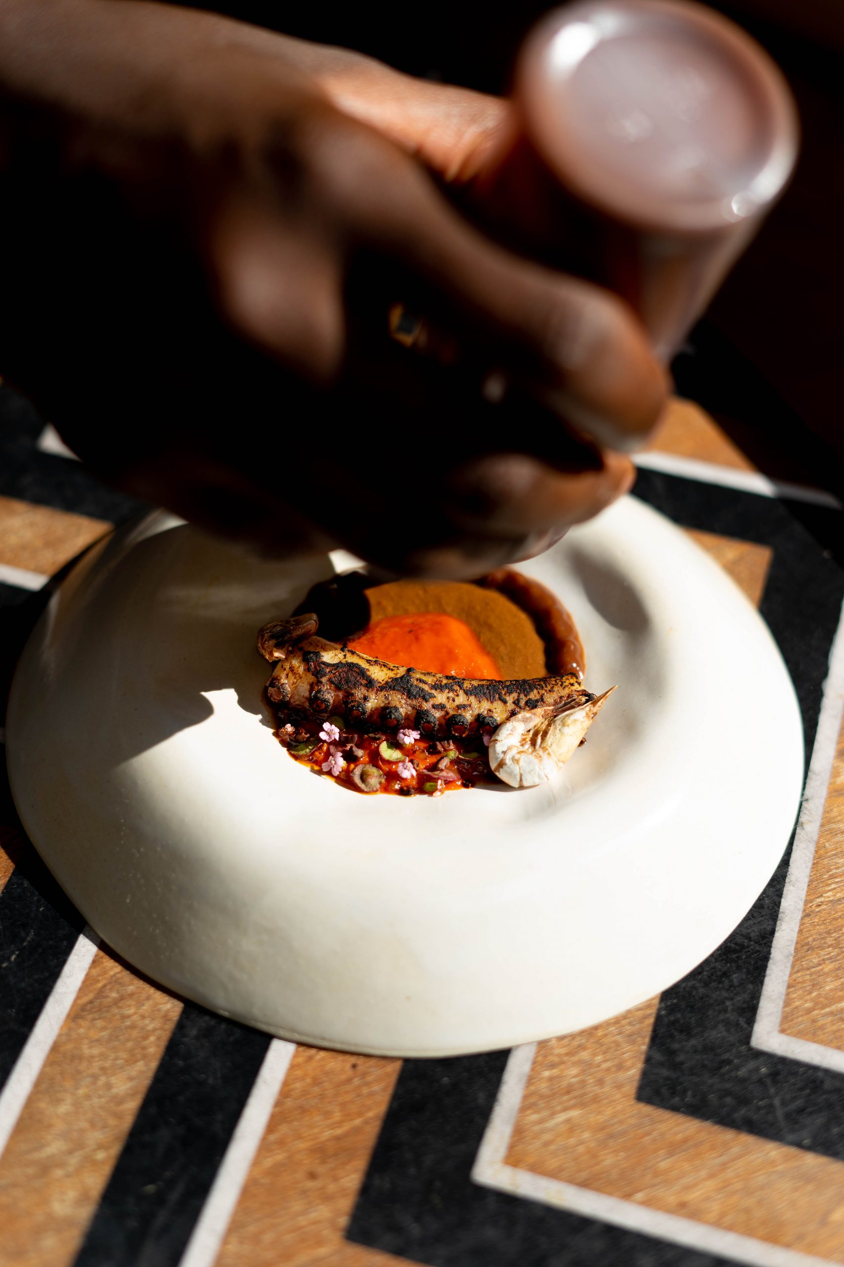 His gastronomic experiences bring in refined visuals and the will to showcase a new vision of African cuisine: far from the fusion, he favors complete blending with Japanese culture. His work is rooted in a trifecta: product, seasoning, technique.