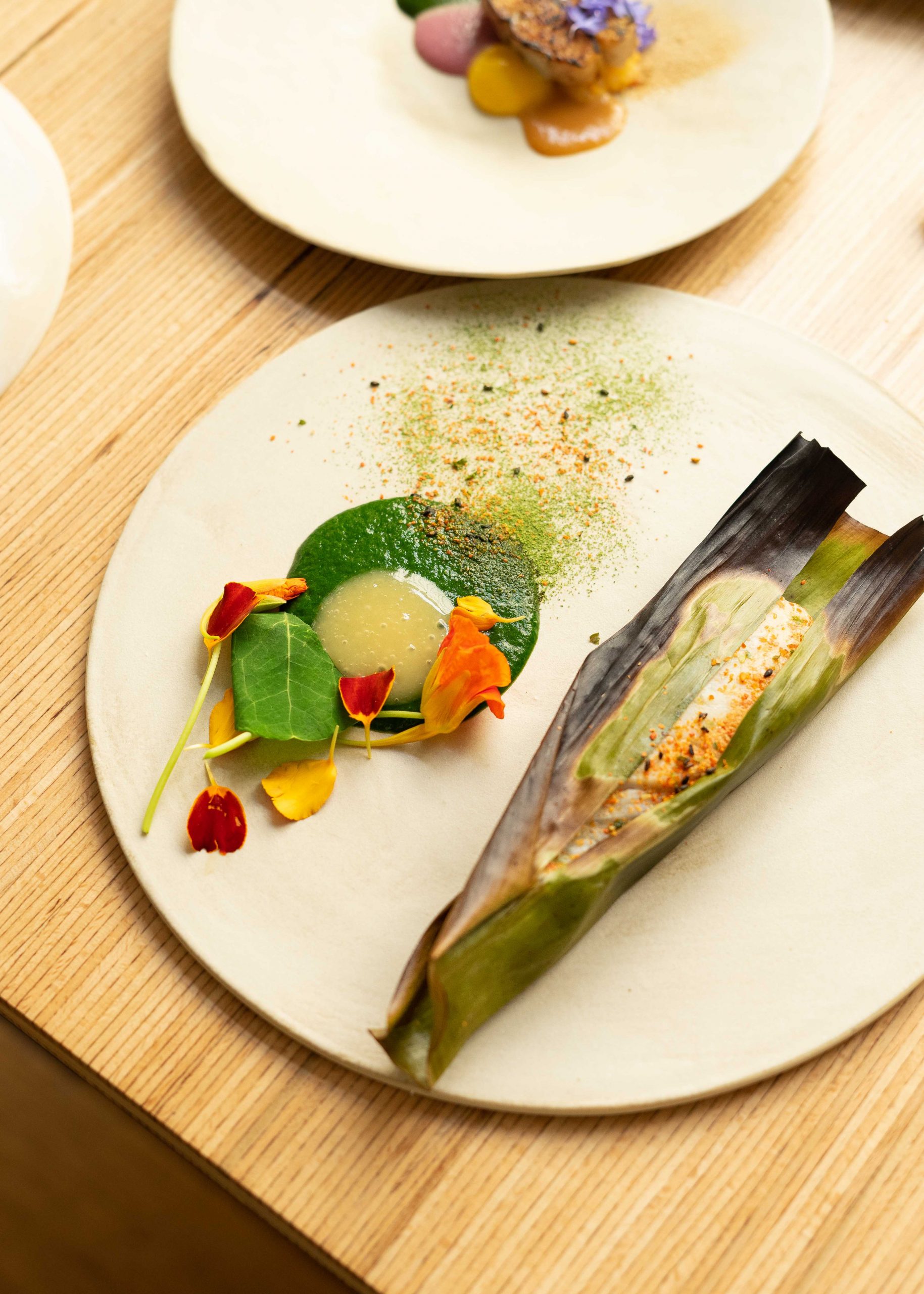 Sole in banana leaf, Attiéké, marigold and lovage, Turbot and plantain with Shito sauce, and the unique marriage of Lobster, fermented hot peppers and tomato miso. Chicken Yassa is enriched with grains of paradise, rice cream and yuzushu. The Gumbo and caviar sticky rice unites Japanese rice, avocado, gumbo, avocado oil and caviar into a delicious blend where each culture brings its own delicious accents.